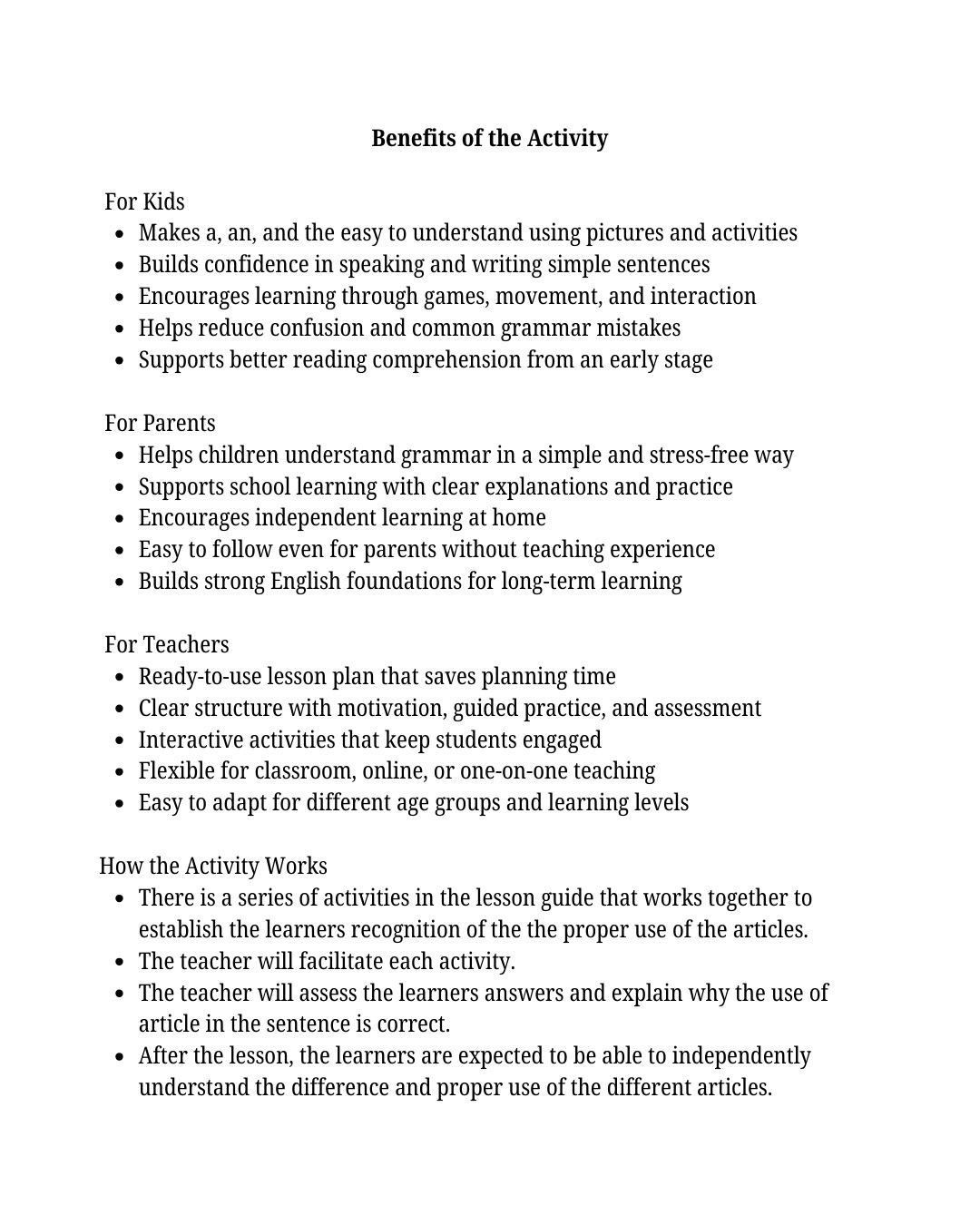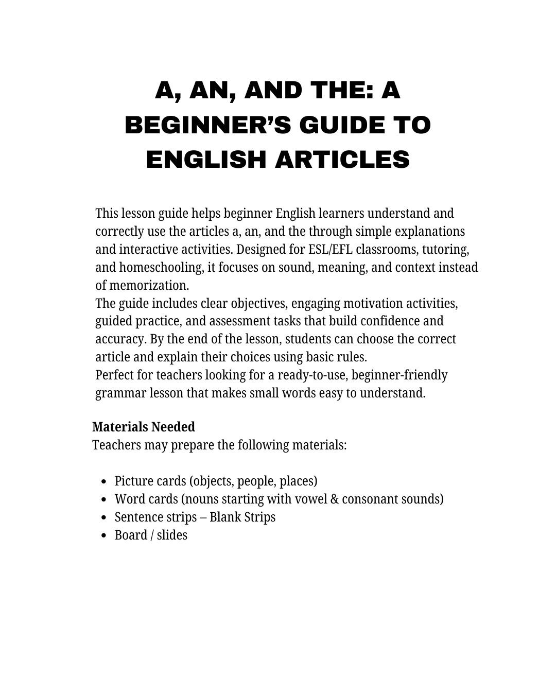 Make learning about English articles enjoyable, engaging, and effective! This 18-page lesson guide is specially crafted for beginner ESL/EFL learners, helping them grasp and properly use a, an, and the through clear explanations and interactive activities. Ideal for classrooms, tutoring sessions, or homeschooling, this guide focuses on sound, meaning, and context rather than relying on rote memorization.