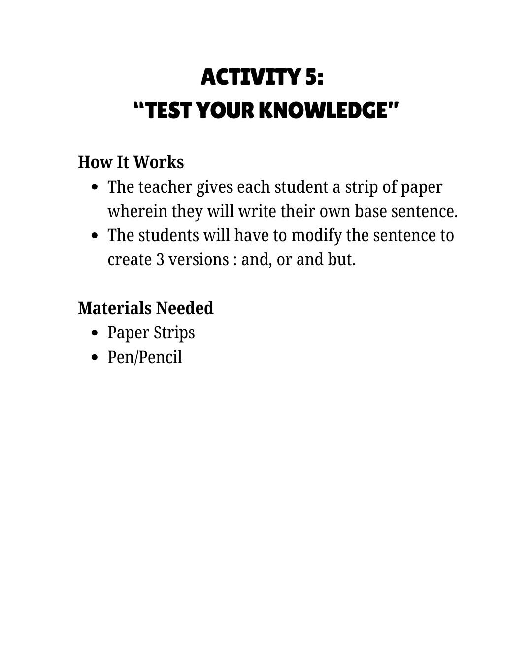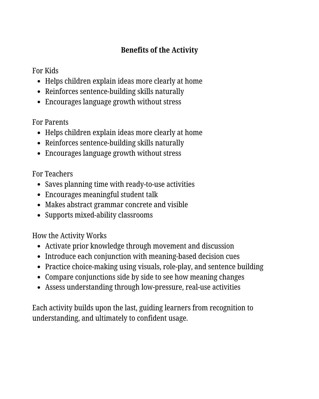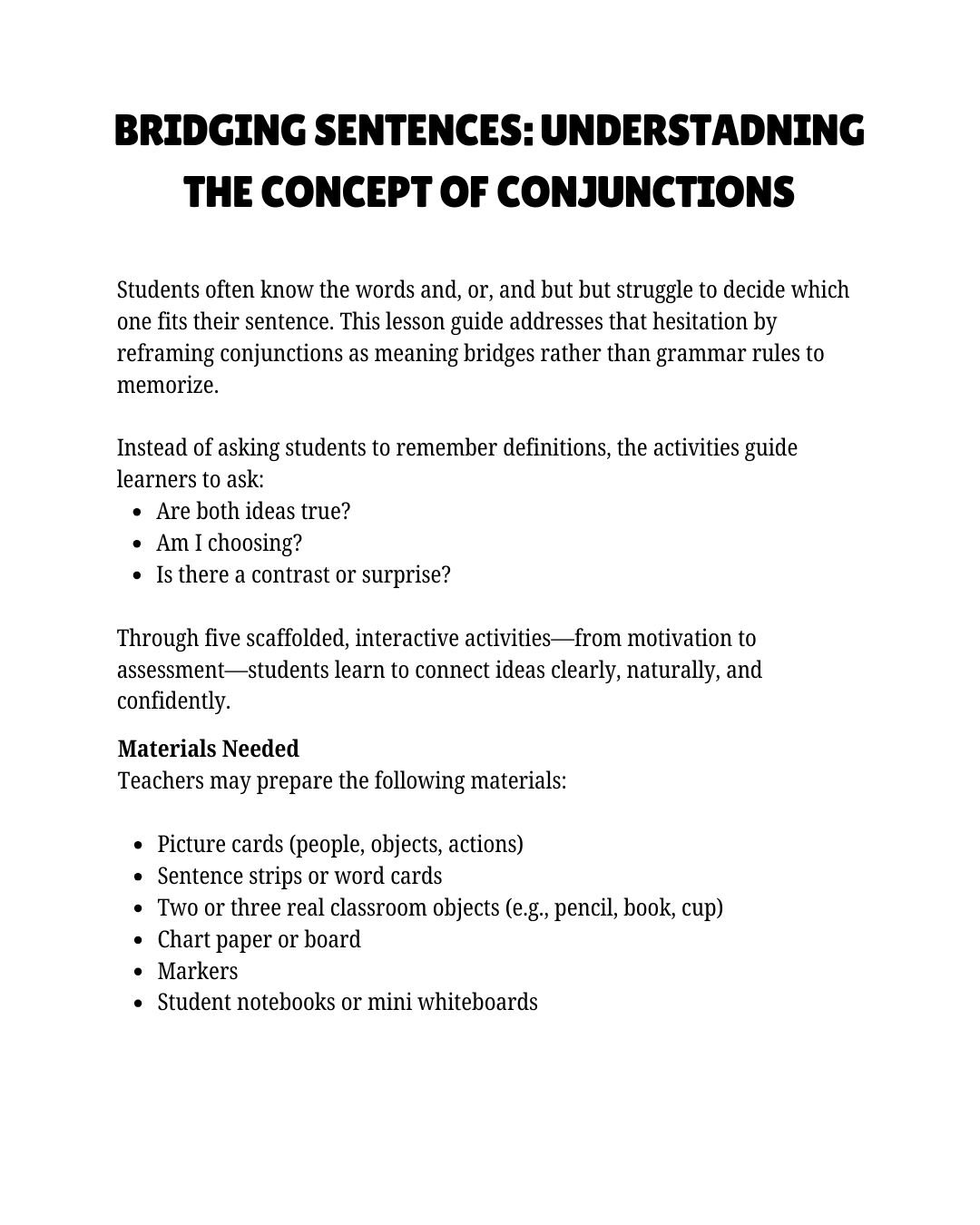 This 16-page interactive lesson guide encourages students to transcend mere memorization of conjunctions, promoting a deeper comprehension of how "and," "or," and "but" influence sentence meaning. Through engaging activities such as movement, visuals, discussions, and collaborative tasks, learners actively practice making deliberate choices when linking ideas. Tailored for elementary school and beginner ESL students, this guide fosters confident sentence expansion in a supportive and stress-free environment.