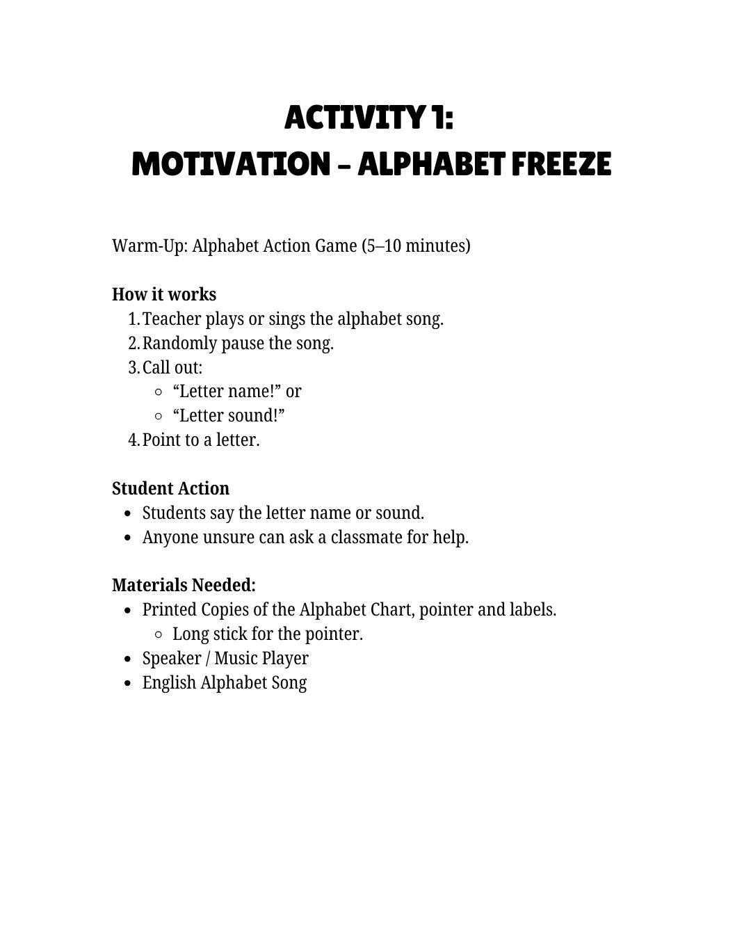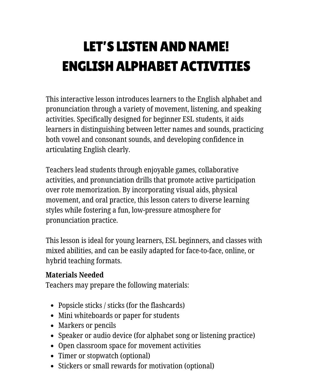 This engaging lesson guide is designed to assist beginner ESL learners in mastering English letter names, sounds, and pronunciation through enjoyable, movement-oriented, and speaking activities. Featuring 6 interactive tasks that are ready to use, students will practice both vowels and consonants while gaining confidence in their speech clarity.