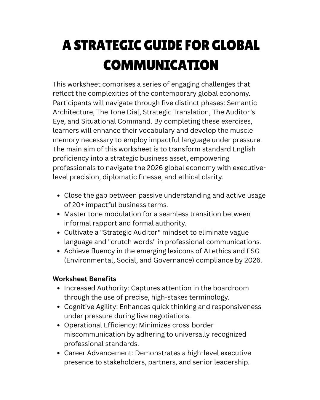 The Executive Lexicon is a sophisticated professional development resource crafted for business leaders and aspiring managers. It transcends basic grammar to connect conversational English with "Boardroom English." By focusing on the strategic use of vocabulary, tone modulation, and professional auditing, this tool is indispensable for anyone aiming to establish authority in international trade, finance, and corporate leadership.