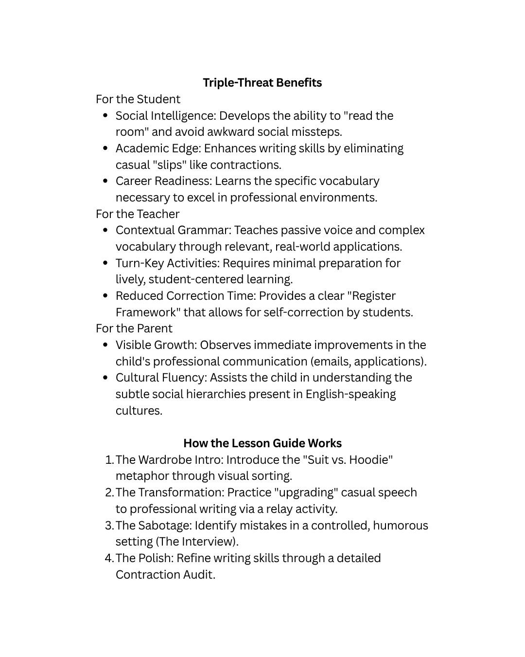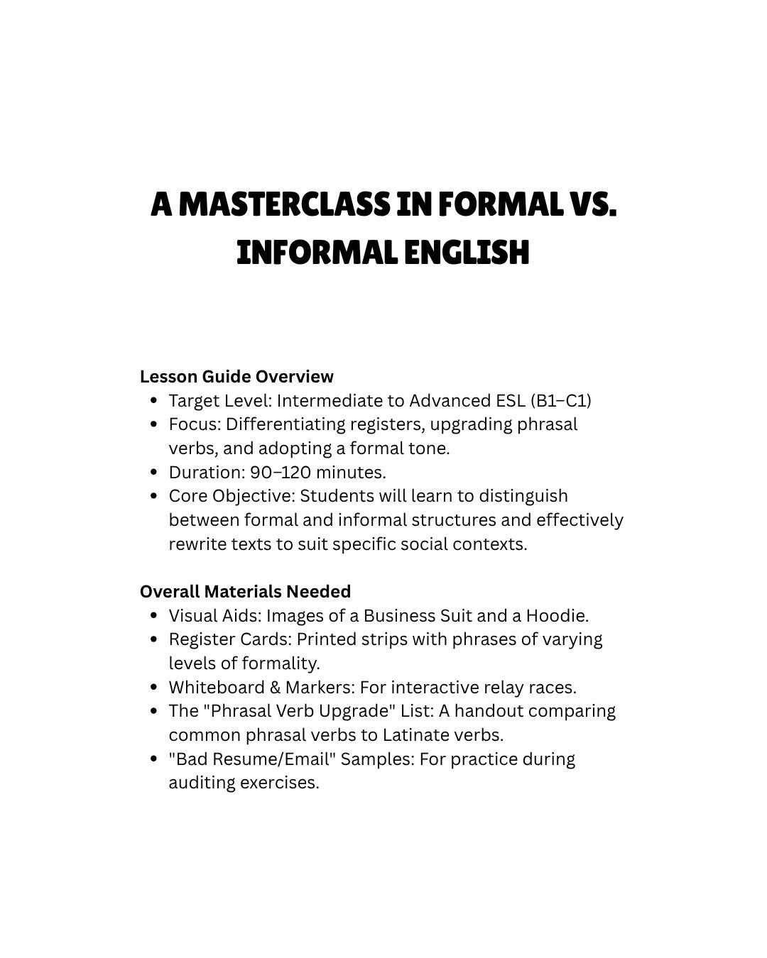Help your students avoid showing up in "pajamas" for job interviews! The 20-pages Linguistic Wardrobe is an engaging lesson guide designed to support ESL learners in navigating the intricate world of social registers. Instead of memorizing tedious grammar rules, students will explore the "social dress code" of the English language. This kit provides a structured method for understanding when to use casual "Hoodie" English and when to switch to professional "Suit" English, equipping them for occasions ranging from casual Friday night gatherings to university admission interviews.