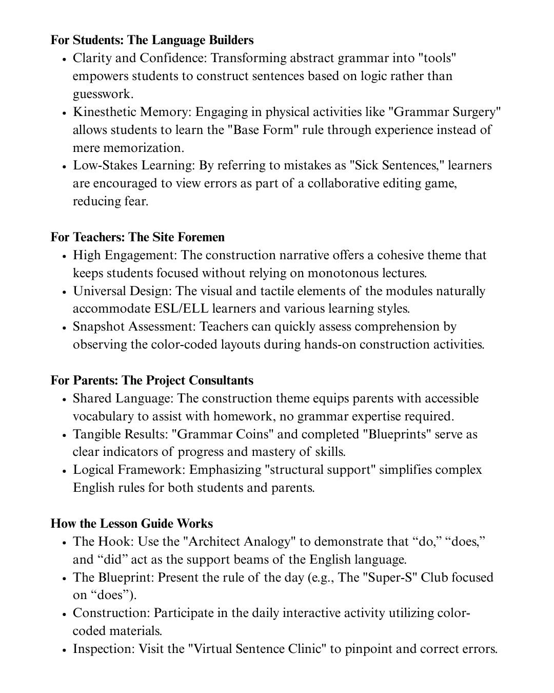 Are your students caught in a "grammar glitch"? Break the cycle of phrases like "I no like" and "Did he went?" with The 28-pages Auxiliary Architects Mastery Kit. This engaging, interactive lesson guide turns mundane syntax into an enjoyable hands-on building experience. Tailored for diverse learners, this kit goes beyond traditional worksheets to offer a multisensory approach, transforming grammar into a game of strategy and exploration.
