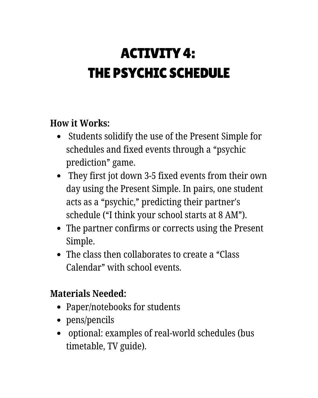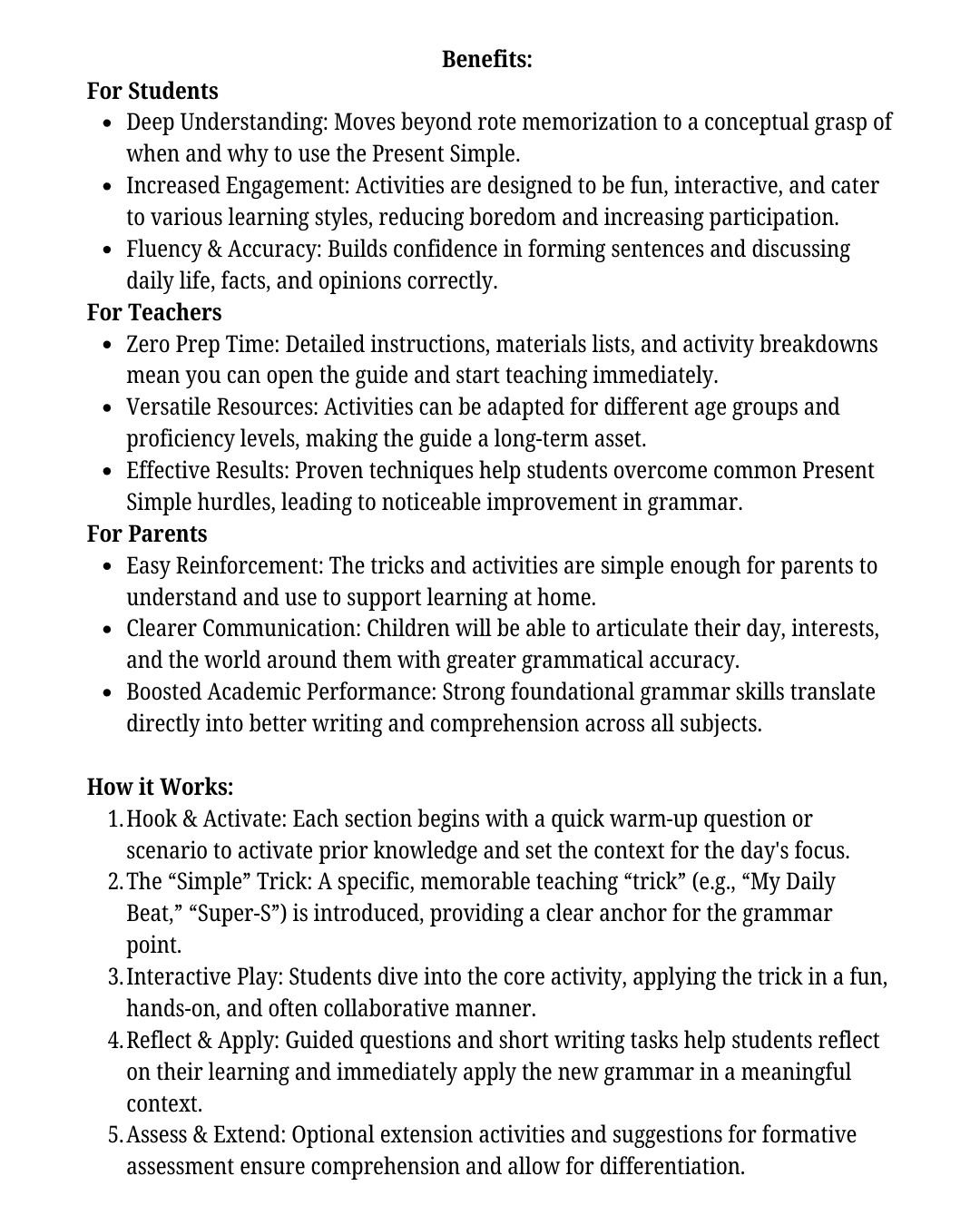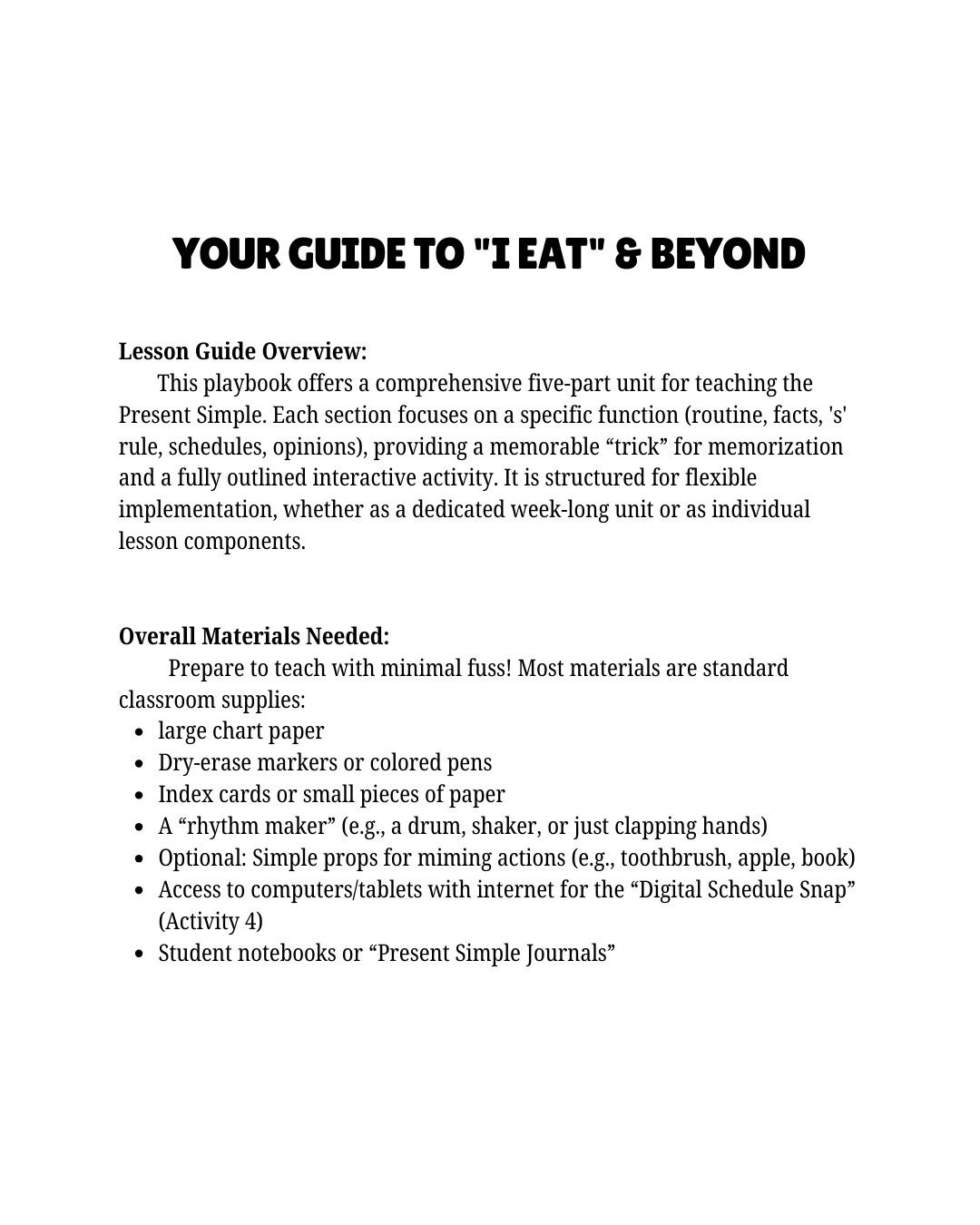 Transform how your students master the Present Simple tense with The Present Simple Playbook! This dynamic, ready-to-use lesson guide is filled with interactive games, hands-on activities, and memorable tricks that cut through the confusion. Designed specifically for teachers seeking fresh techniques, it simplifies daily routines, universal facts, schedules, and opinions into engaging, actionable lessons. Say goodbye to blank stares and hello to confident “I eats” and “she runs”!