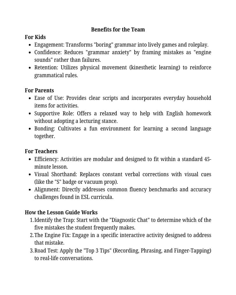 The 20-page Verb Velocity Lab is an interactive and engaging lesson guide designed to help learners navigate the five most common "Verb Traps." Instead of relying on tedious drills, this guide employs physical movement, visual metaphors, and storytelling to turn grammar into an enjoyable experience.